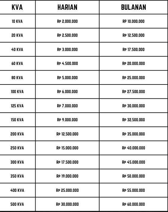 Harga sewa genset untuk 240 jam operasional per bulan , kelebihan jam dihitung secara proporsional
